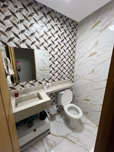 Pavimento Inferior: área gourmet perfeita para reunir amigos e familiares, 1 banheiro completo e 1 lavabo adicional.