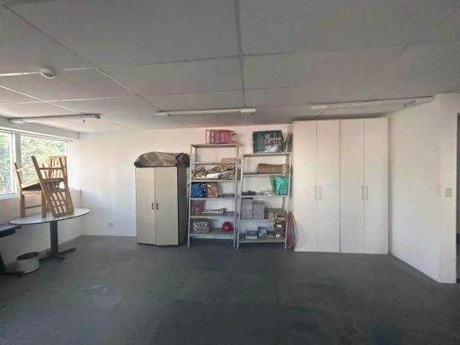 Sala comercial, 45m² com piso elevado, acabamento em laminado e forro mineral, com ar condicionado, mesas e cadeiras