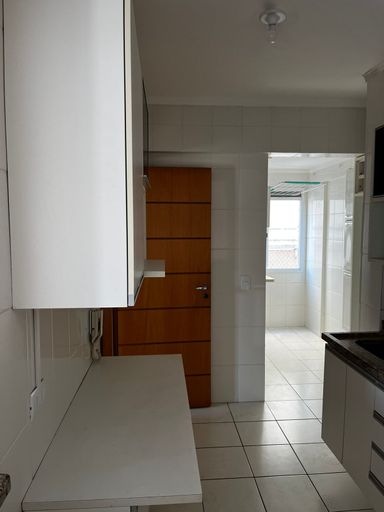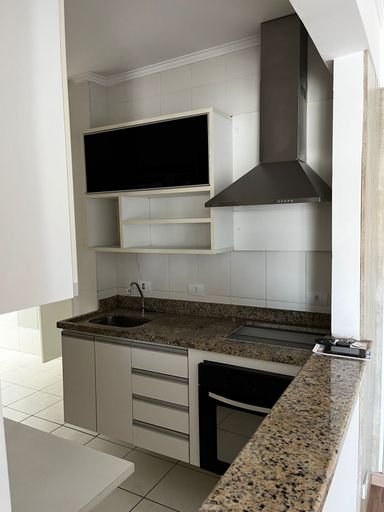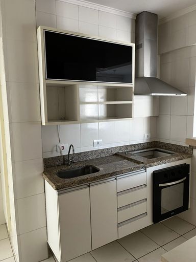 Cozinha americana possui coifa, forno elétrico e ligação pronta para cooktop.