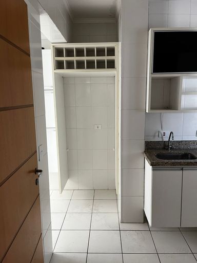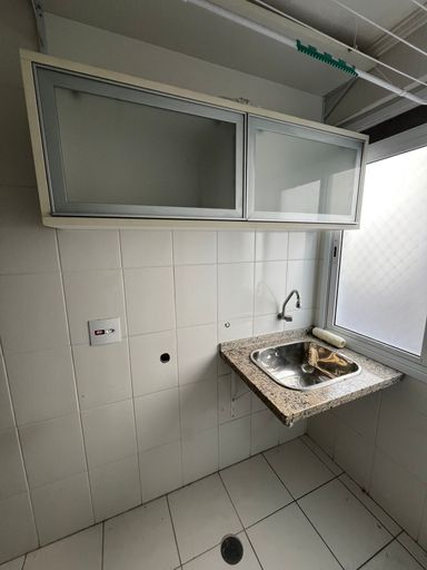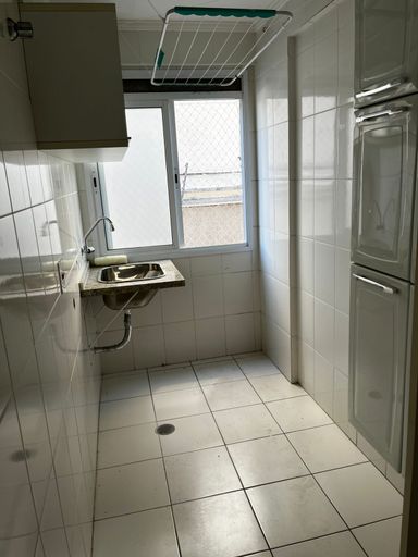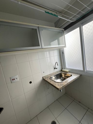 Área de Serviço com armários, tanque de inox e varal no teto já instalado.