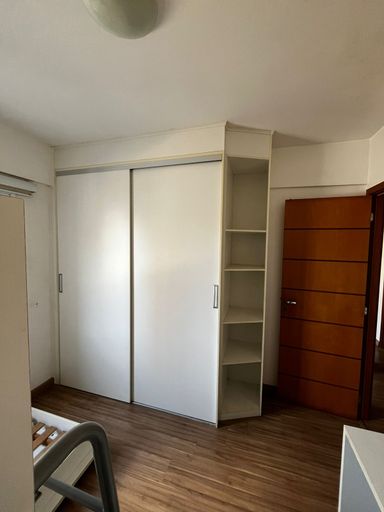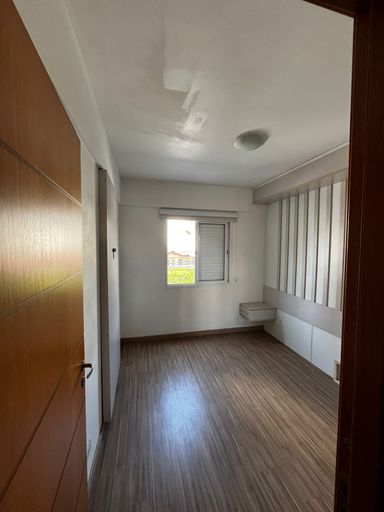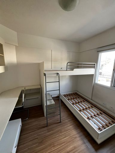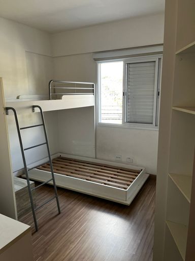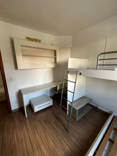 Um quarto com beliche e mesa de estudos, além de armários embutidos, e o outro quarto possui cabeceira embutida, criados mudo e armários embutidos com espelhos na porta.