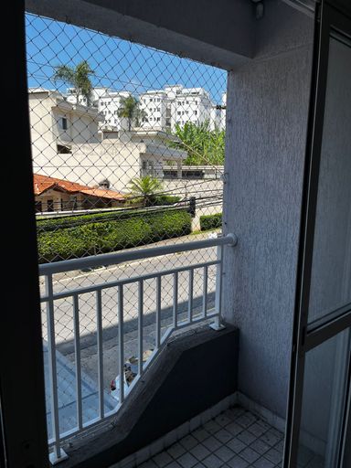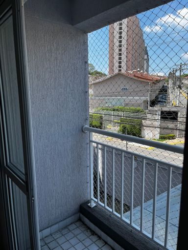 Sala com rack para TV e detalhe de espelho grande e varanda com tela de proteção.