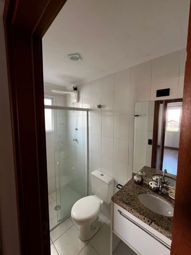 Banheiro com blindex, chuveiro elétrico, espelho e armários.